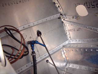 その奥のパイプはメインギヤ。多数のリベットが打ち込まれた縦部材は主桁のスティフナー。