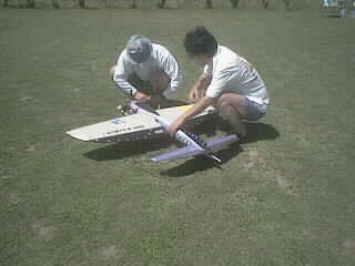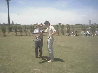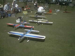 手前から、比気さん、横山さん、湊さん、宮内さんのコンテスト機、調整中の背中は大場さん、その横の小さな「白」が小美濃の.02機、そして赤い機体は吉松さんの「ファイヤーバード15改」です。