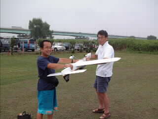 柳沼さん設計製作の「狼」(大)の初飛行。助手は斉藤さん。