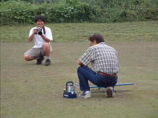 操縦訓練を取材する鈴木さん(RCAW)。助手は湊さん(背中)。