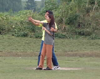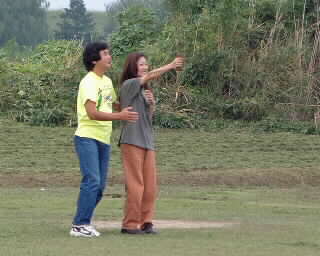 訓練生に手を添える中林教官。彼女、初フライトだそうです。
