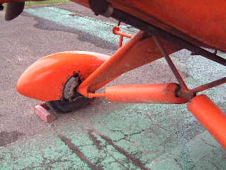 ●付録1 実機のスパッツの取り付け部を撮影しました。 飛行方向にステーが入り、2本ずつのボルトで固定されます。地面の赤い木は「チョーク」。
