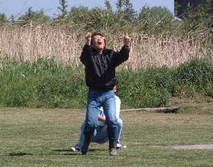 両手で2機を操縦する湊さん。影は助手の横山さん。