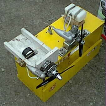 左の白いテストベンチは「ロータリー」用で,最近入手した小美濃のロータリーエンジンがくくられています.