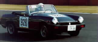「MGミジェット1500」です。写真は筑波サーキットの最終コーナーを抜けるところです。 1975年製ですので、そろそろクラシックカーの仲間入りでしょうか。