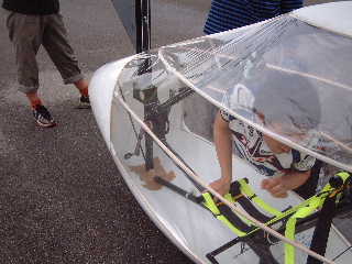 小さなコックピットにはこんな格好で乗り込みます。