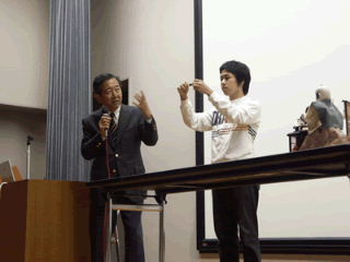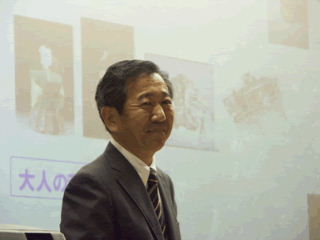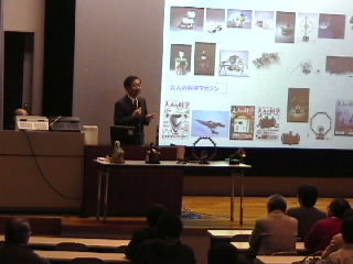 演壇の小美濃。科学実験や人力飛行機も話題にしました。