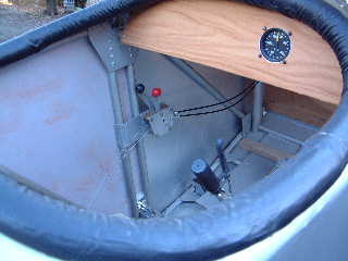コックピット。操縦桿のレバーはブレーキ用。左の「赤」「黒」はスロットルと、(おそらく)ミクスチャ用の操作レバー。