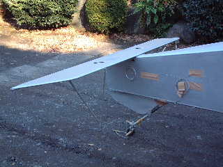 水平尾翼の取りつけ。尾輪はフットバーからダイレクトに操縦索で繋がります。