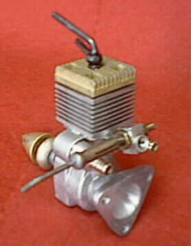チェコスロバキア製のディーゼルエンジンです。 四角のシリンダー・ジャケット・フィンに色つきのアルミ製の四角のヘッドがついた 小型エンジンは、MVVSエンジンで有名なチェコスロバキヤ製のもの。ピスト ンバルブ方式で、シリンダー・ライナーには対向して排気、前面に吸気、後面に掃気のポ ートが設けられており、ボア/ストローク比は1.5:1、ピストンはさすがに(?)丸く、頭部 は平らで、一般のエンジンより長め(ロング・スカート)になっている。ボア8mm、ストロ ーク12mm、排気量0.6032cc。