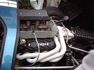 同車のエンジン。ミッドシップに搭載された「V8」。左が前方です。