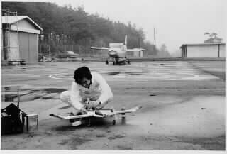 格納庫前でラジコン機の飛行調整をする小美濃。機体は非対称双発機。