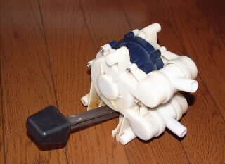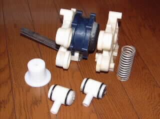 分解したギャレイポンプの部品。 手前の「T字型」は給水、吐出用のワンウェイバルブ。スプリングはリターン用。