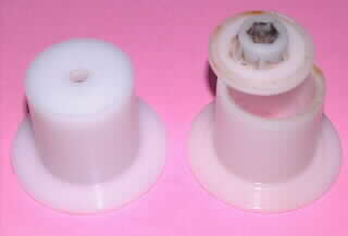 右がパックリ壊れたダイヤフラムの押さえパーツ。左は「510製作所」に依頼した精密に削出した部品(ジュラコン製)。