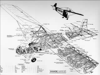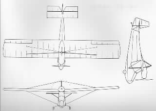エンジンはVWの1200〜1500cc、3000rpmで25馬力以上出ればOKです。 桁は2本とも「ムク」、スプルースの板のまんまで、ほとんど加工なしです。 前後の桁はリボン状のスプル−スで「×状」に結合されます。何故か「ガセット」無しです。