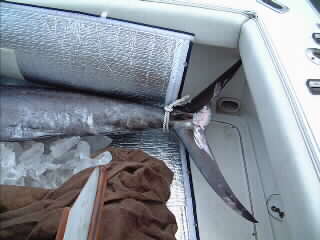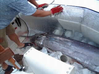 隣に停泊したモータークルーザーが釣り上げた「カジキ」です。110kg超えの「クロ」です。