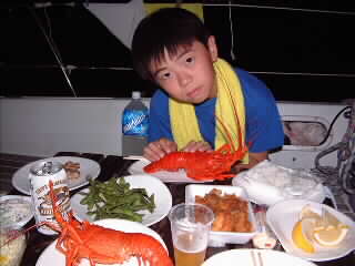 船内でゆであげた伊勢海老を手にご機嫌!