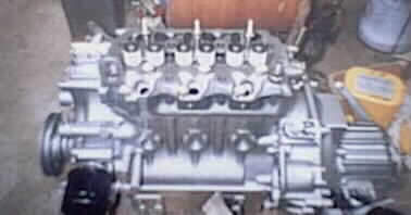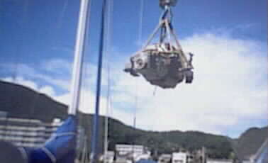 エンジンルームからクレーンで吊り上げた、3気筒ディーゼルエンジン。カッ