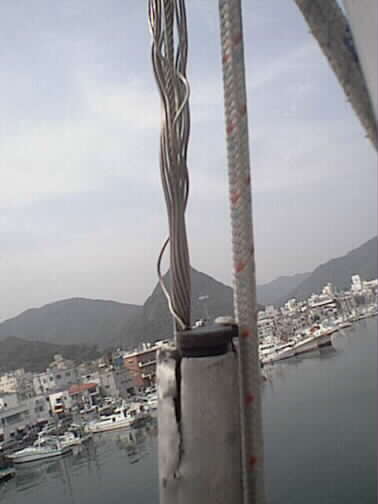 フォアステーがマストトップでファラーのパイプに干渉したようです。